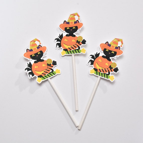 12 Halloween Cat Cupcakes Halloween Centerpiece Halloween Birthday Cake Toppers Halloween Cat Party Decor Halloween Baby Shower