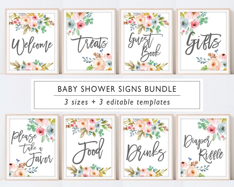 Baby Shower Signs Bundle Printable Baby Shower Decor Signage Baby Shower Editable Template Blue Watercolor Floral Bpb26