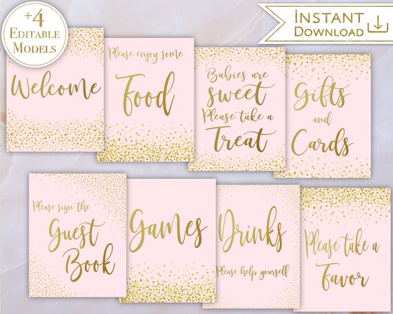 Baby Shower Signs Kit Set Editable Baby Signs Pdf Template Signs Baby Pink Gold Confetti Posters Blush Golden Digital Print Instant Download