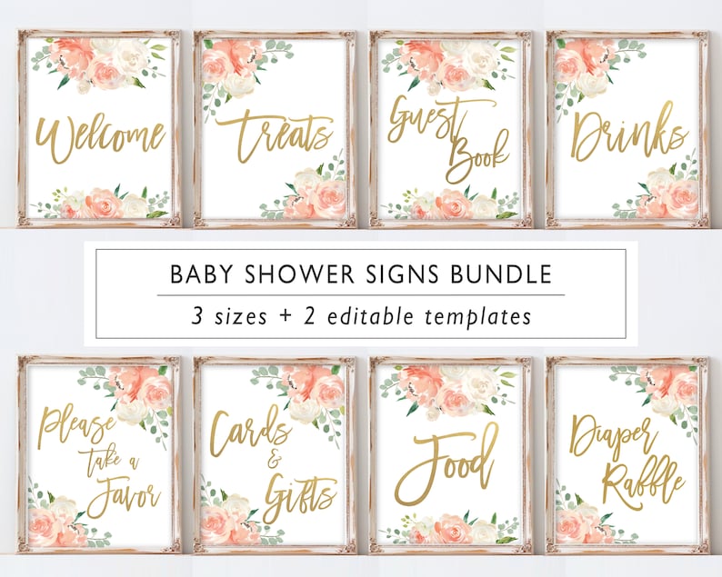 Baby Shower Signs Bundle Printable Baby Shower Decor Peach Cream Gold Watercolor Floral Baby Shower Signage Bp08
