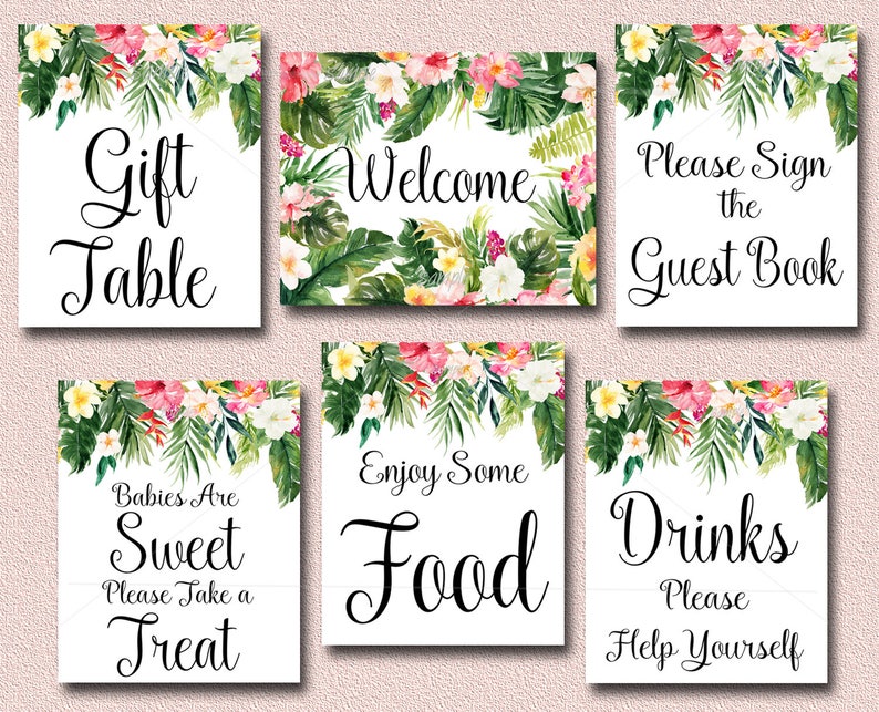 Tropical Baby Shower Table Signs Set Of 6 Printable Luau Baby Shower Signs Instant Welcome Drinks Food Gifts Treat Guest Book 040