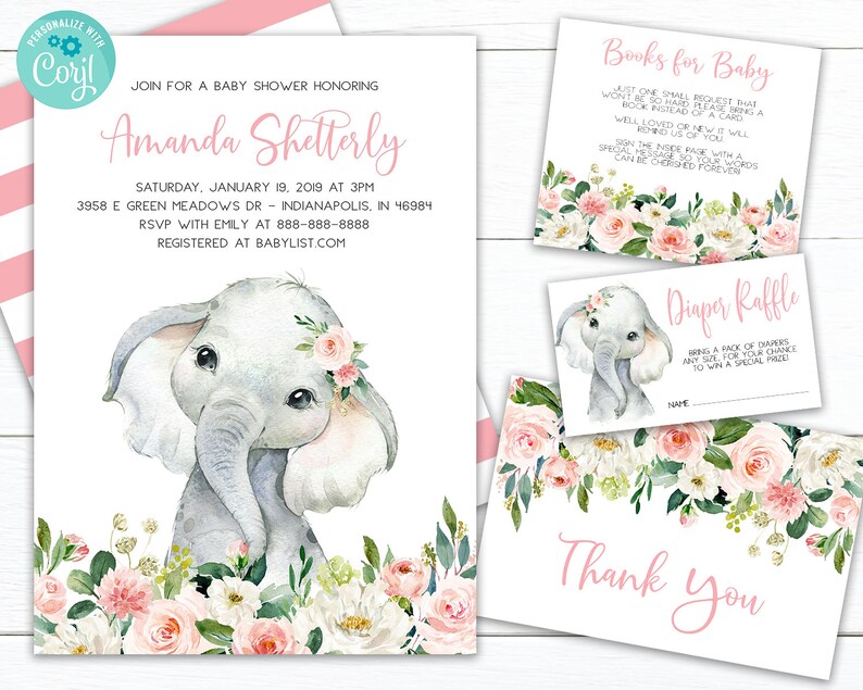 Pink Elephant Baby Shower Invitation Set Blush Baby Shower Editable Pink Printable Invitations Girl Baby Shower Ideas Pf100