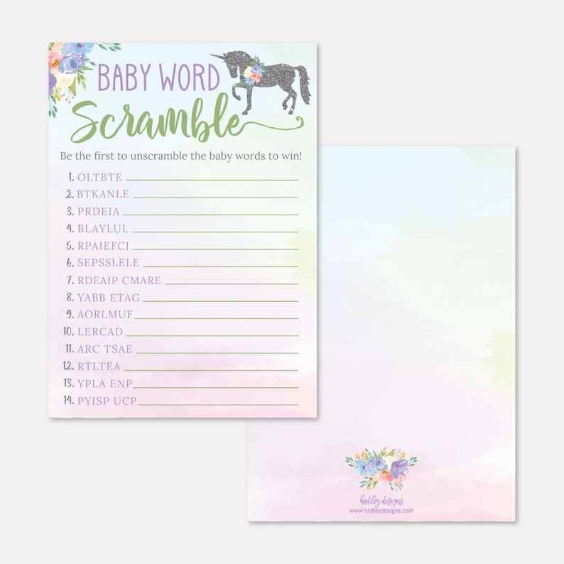 Silver Glitter Unicorn Baby Shower Word Scramble Game Template Word Scramble Baby Shower Game Word Scramble Shower Game Scramble Printable