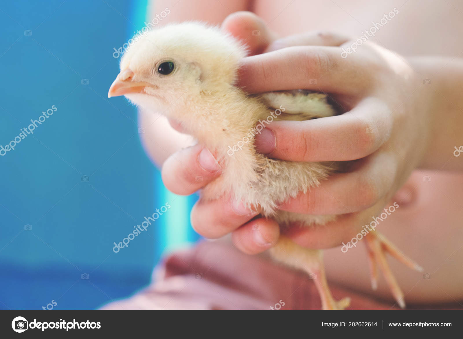 Little Baby Chicks Child Hands Love Care Concept Chicken