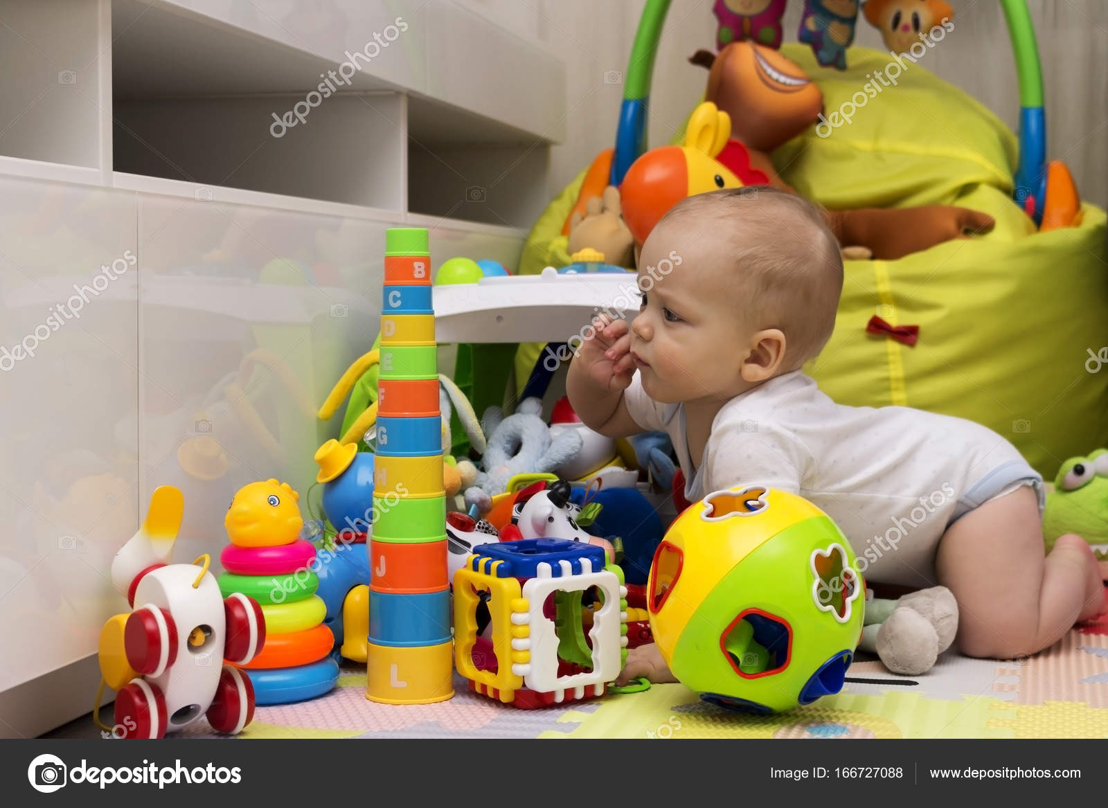 Portrait Of A Beautiful Baby Boy On The Floor With Music Toys