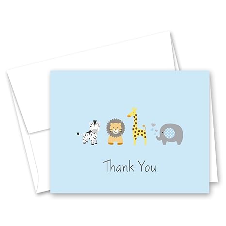 50 Safari Animals Baby Shower Thank You Cards Light Blue