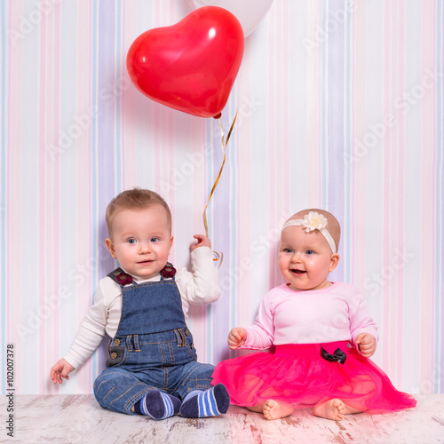 Baby Boy And Girl Playing With Heart Balloons For Valentines