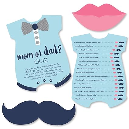 Baby Boy Mom Or Dad Quiz Cards With Mustache And Lip Cutouts Blue Baby Shower Game Set Of 20