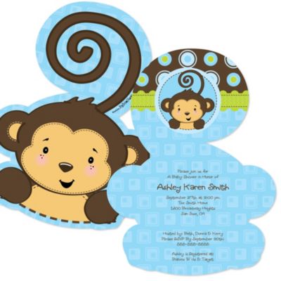 Blue Monkey Boy Shaped Baby Shower Invitations Set Of 12
