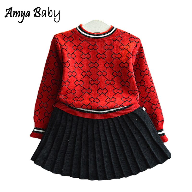 Amya Baby Toddler Girl Winter Outfits Knitted Sweater Pleated Skirt 2pcs Autumn Girls Clothing Set Christmas Girls Outfit Sets Y190518