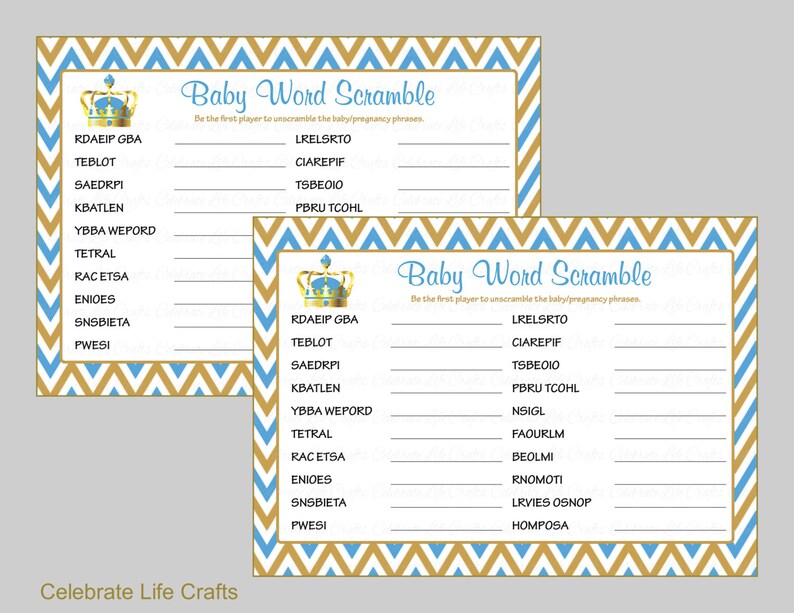 Crown Baby Shower Word Scramble Game Printable Games Baby Boy Little Prince Theme Blue Gold Chevrons Answer Key Included B23004
