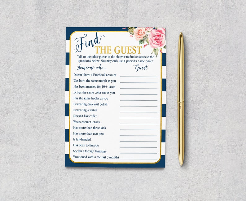 Navy Gold Bridal Games Find The Guest Guests Questions Quiz Baby Shower Fun Wedding Printable Floral Blue Pink Ng Nb Instant Download