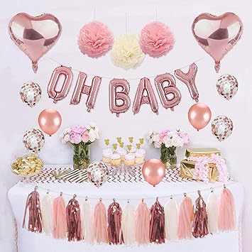 Kwayi Baby Shower Decoration Set Rose Gold Theme Baby Shower Decoration With Oh Baby Banner Rose Gold Balloon And Tissue Paper Pom Poms Toal 35pcs