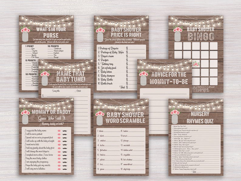 Floral Baby Shower Games Package Rustic Wood Mason Jar Baby Shower Funny Baby Shower Set Country Shower Activity Pack Baby Games Bundle