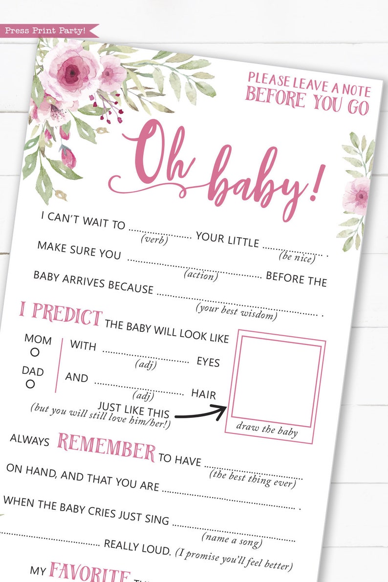 Baby Shower Activities Printable Oh Baby Mad Libs Advice Cards Printable Baby Shower Games For Girl Pink Flowers Instant Download