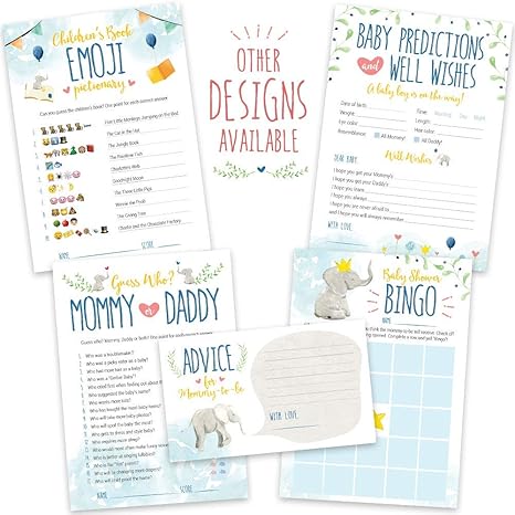 Baby Shower Games For Boys Blue Elephant Theme Pack Of 5 Activities 50 Guests 250 Cards Total Includes Baby Predictions Baby Bingo Emoji
