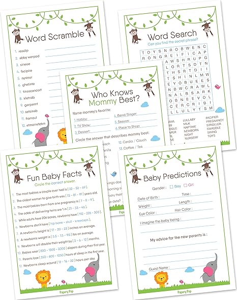 Baby Shower Games For Boys Or Girls Set Of 5 Activities 50 Cards Each 250 Total Baby Shower Supplies Safari Jungle Zoo Animals
