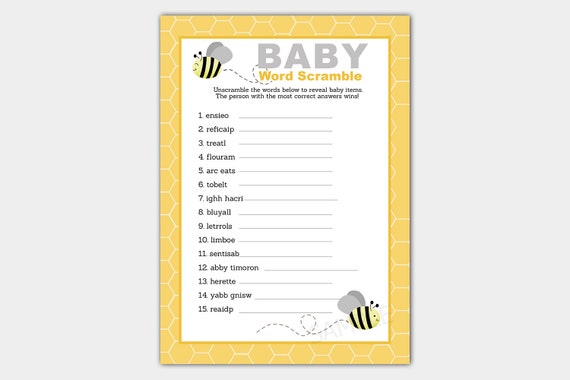 Gray And Yellow Bumble Bee Baby Shower Game Word Scramble