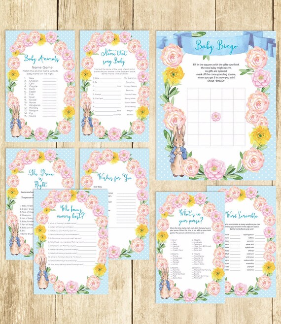 Rabbit Peter Baby Shower Games Package Activities Ideas Eight Printable Games Bingo Price Is Right Purse Game Animals For Boy Fun 0071 B