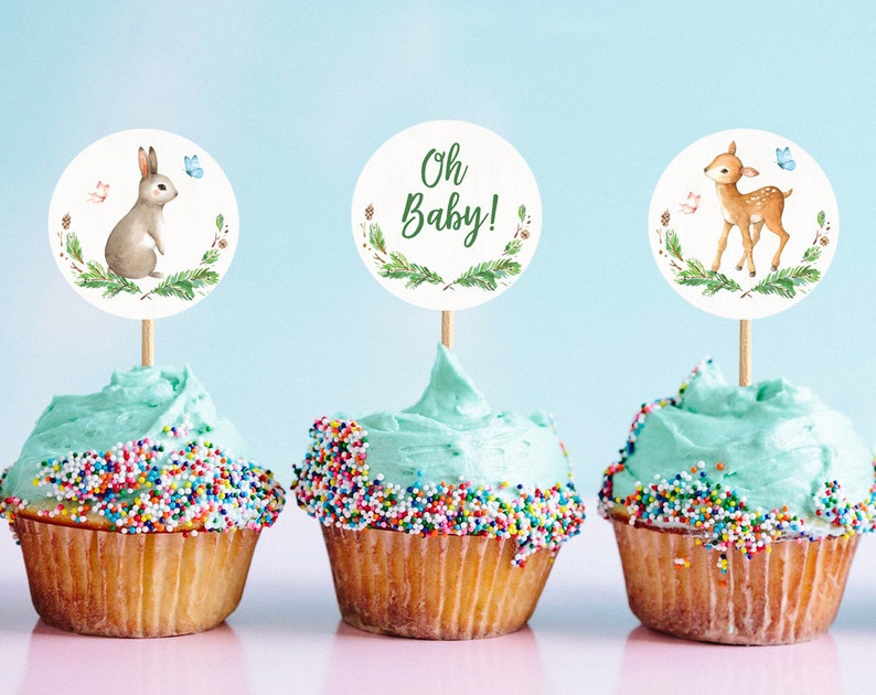 Baby Shower Cupcake Toppers Printable Cupcake Toppers Woodland Animals Rustic Greenery Bunny Deer Gender Neutral Oh Baby Mcp801