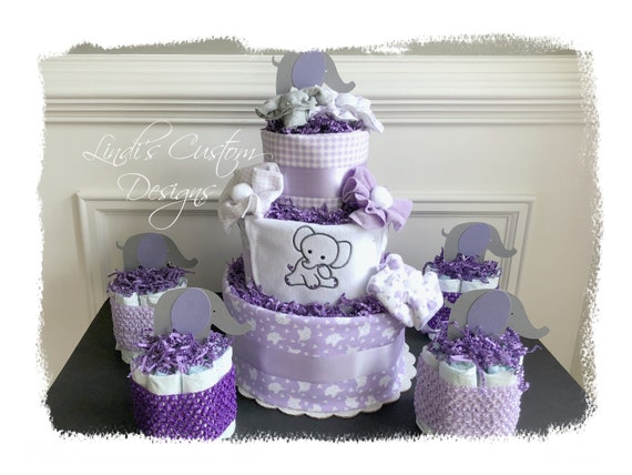 Girl Diaper Cake Girl Baby Shower Diaper Cake Set Purple Elephant Diaper Cake Purple Gray Baby Shower Table Decor Embroidered Baby Gift