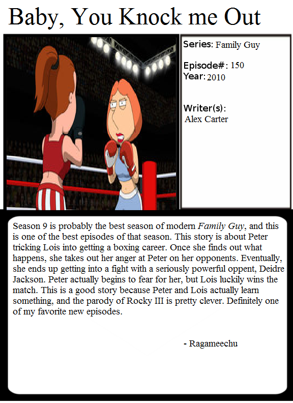 Lois becomes a champion foxy boxer and peter acts as her manager. Watch tv show family guy episode 905 baby you knock me out online for free in hdhigh quality. You will watch family guy episode 905 baby you knock me out online for free episodes with high quality.